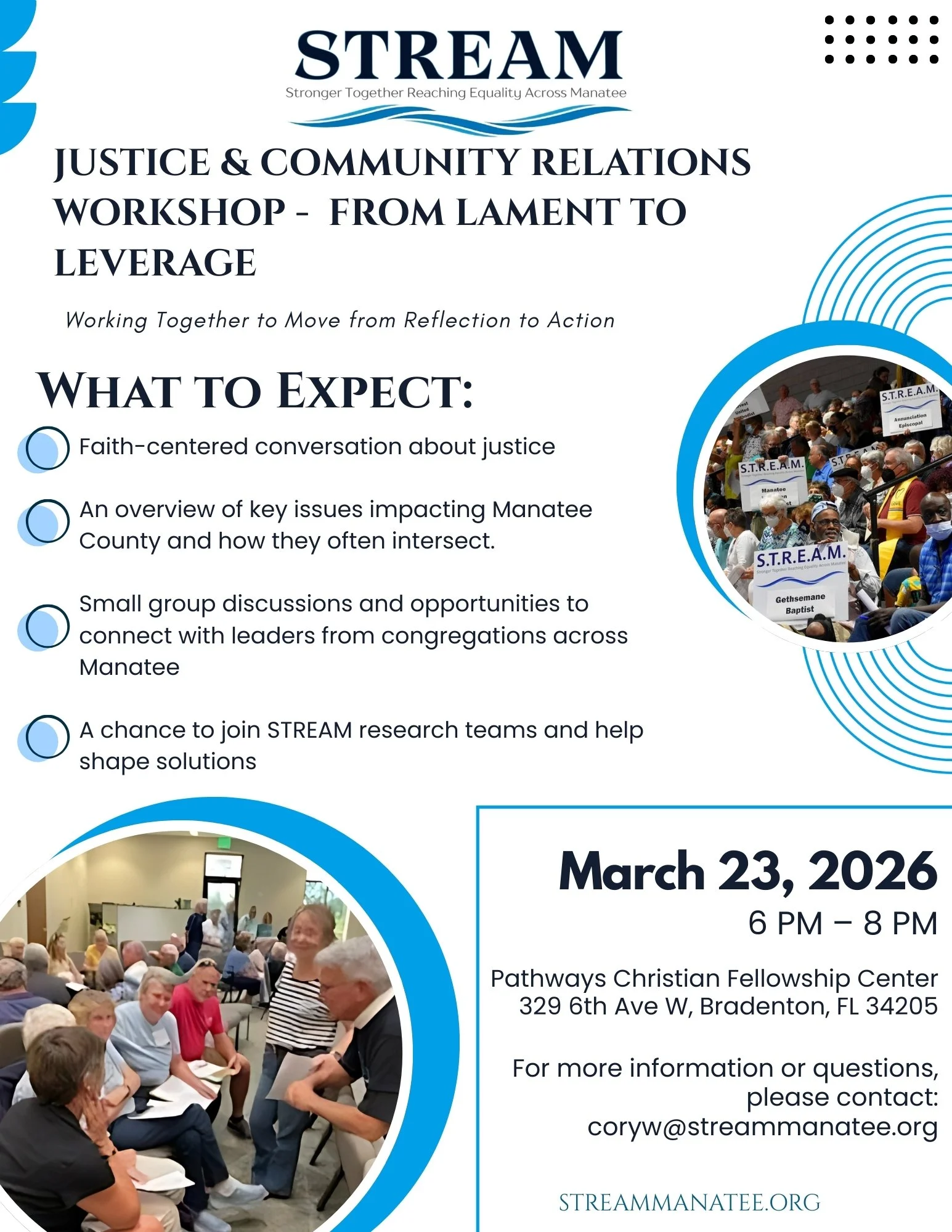 STREAM (Stronger Together Reaching Equality Across Manatee) is a nonpartisan, grassroots organizing group uniting faith communities to answer the call to seek justice and solve critical community problems in Manatee County. Our name STREAM reflects our vision of a community where justice flows like a never-failing stream (Amos 5:24). We believe “loving our neighbor” means standing up and acting to provide fairness and justice for all.